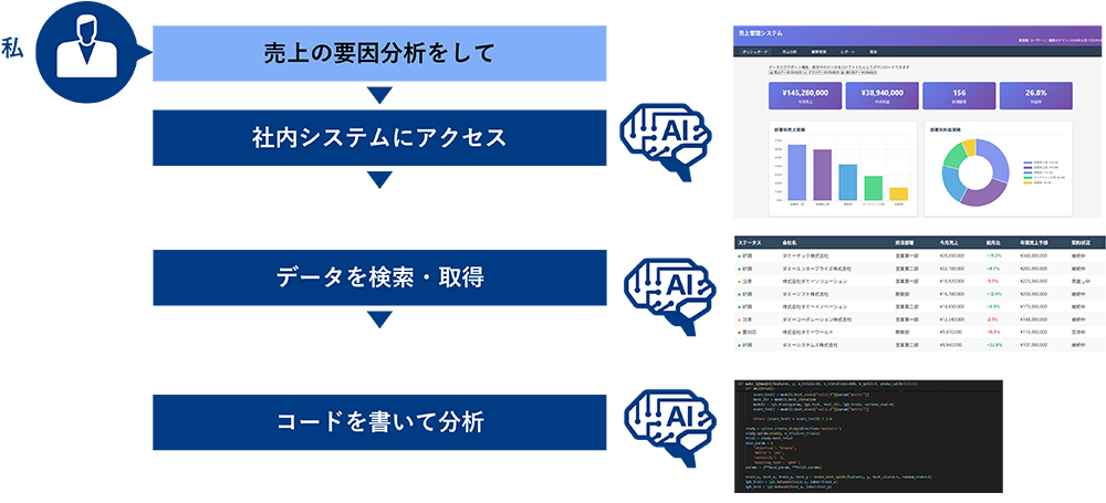 AIエージェントは業務代替を目指すため、仕様の聞き取りや、社内チャットでの問い合わせなど対話を含む進行を設計すべきである。ただし、問い合わせ先はAIエージェントであってもよい。
