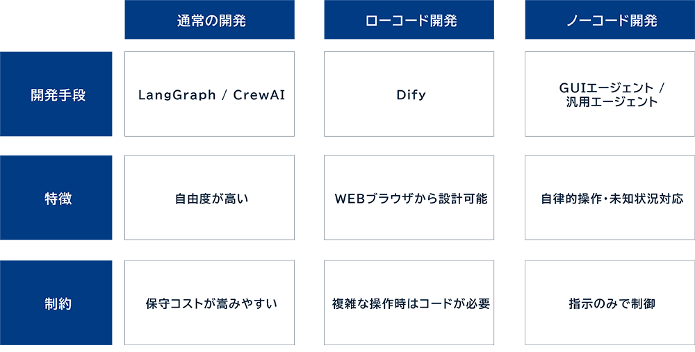 GUIエージェントに限らず、生成AIを活用したAIエージェント開発の手法には3つの方針がある。