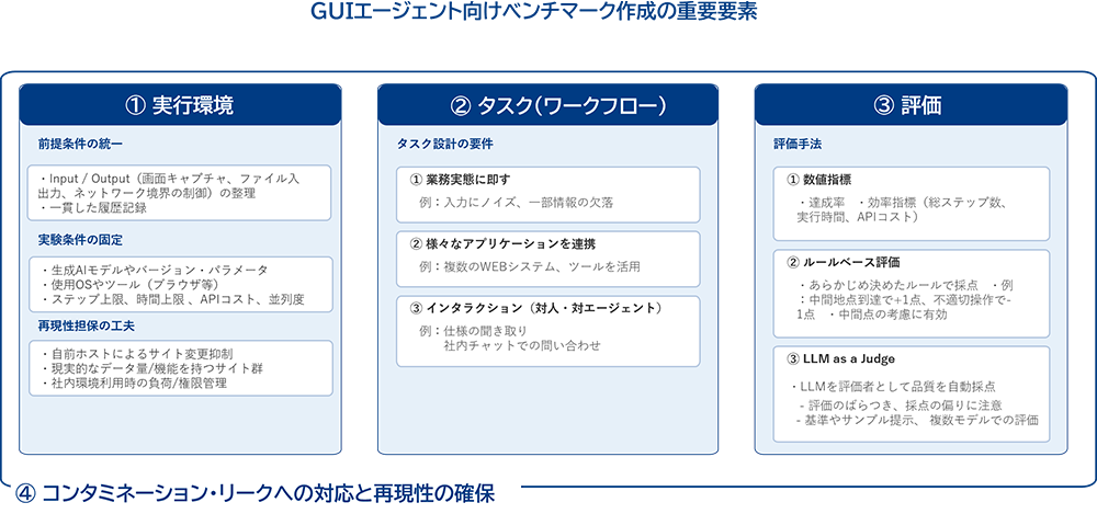 ベンチマークを作成するにあたっては「①実行環境」、「②タスク(ワークフロー)」、「③評価」、「④コンタミネーション・リーク(漏洩)への対応と再現性の確保」が重要である。エージェントを評価するベンチマークの多くは英語で作成されている。日本国内で実務適用を行うことを考えると、日本語のタスク指示、日本語のUI、日本語のデータを前提に設計することが重要である。