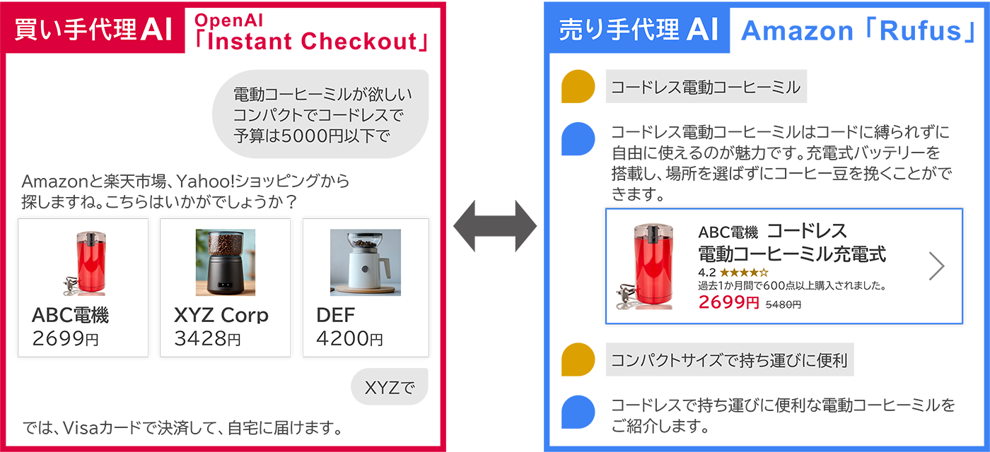 米国で2025年9月にリリースされたOpenAIの「Instant Checkout」では、「最近ダイエットに熱心な母への誕生日プレゼントは何がいい?」と聞くだけで、ChatGPTが条件にあう候補を挙げて評価するだけでなく、直接購入まで行えるようになっている。通常の購買プロセスのうち、商品検索、価格比較、評価をAIエージェントが代替しているのだ。消費者は個別のECサイトにアクセスすることなく買い物を完了できる。